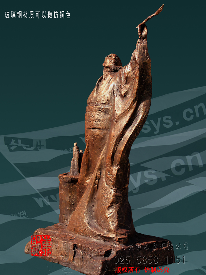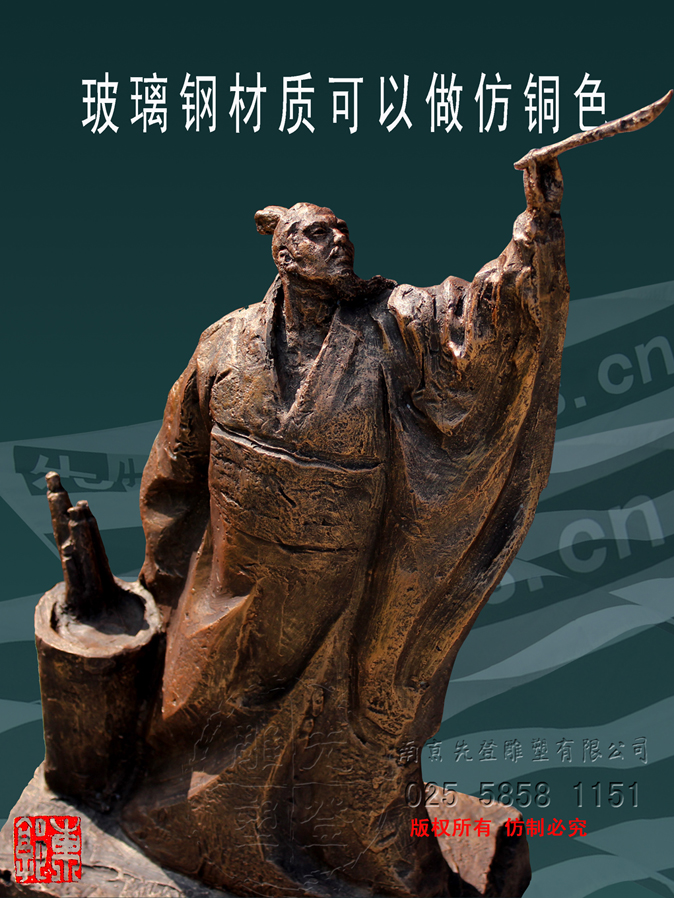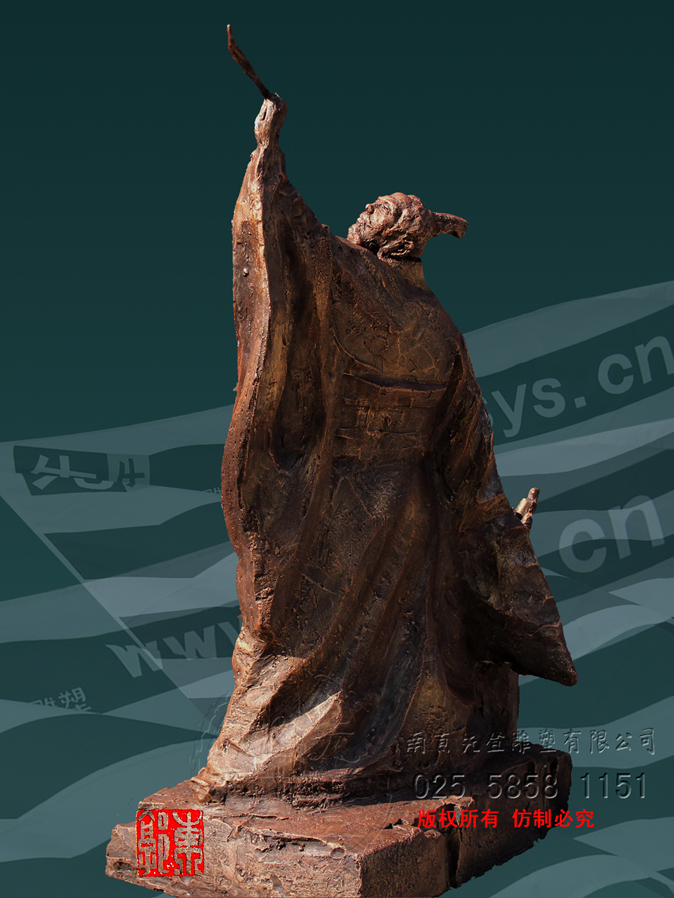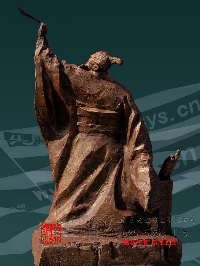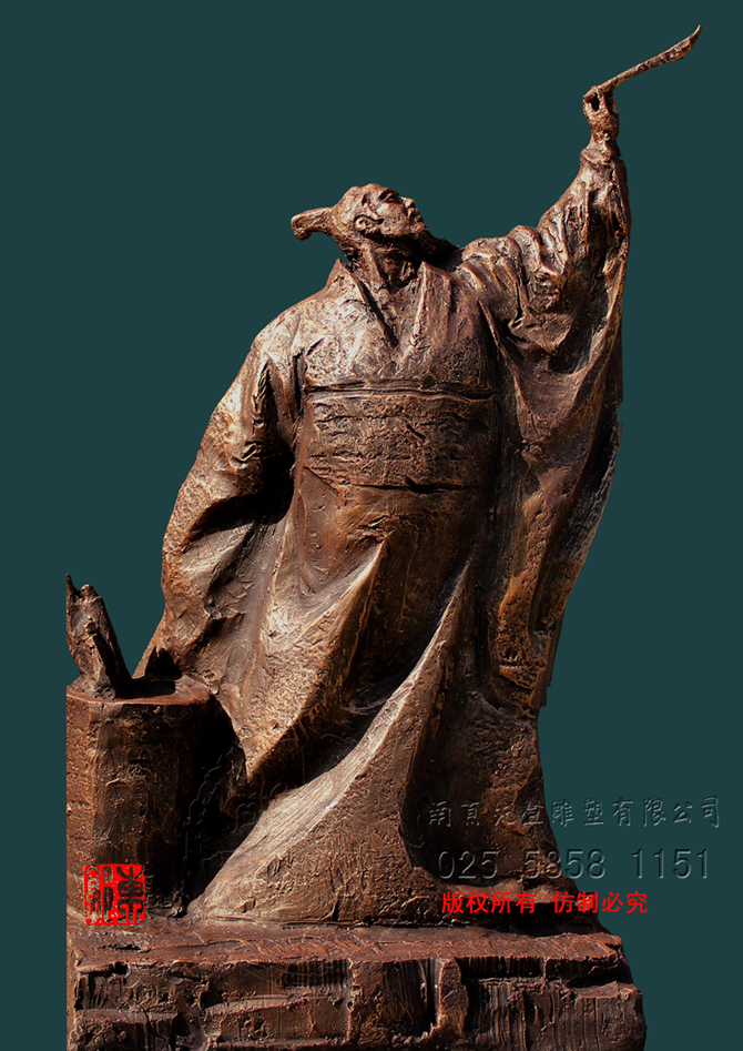 張芝字伯英,出生官宦之家,幼時高操,勤習(xí)學(xué)書,朝廷賞識,令他做官,而他并非貪圖高官厚祿,甘做布衣。素日臨池學(xué)書,得崔杜之法,復(fù)而變之,遂成“今草”。張芝對書藝癡醉令人驚嘆。衛(wèi)恒《四體書勢》里有言“凡家之衣帛,必先書而后練之。臨池學(xué)書,池水盡墨。”張芝對于書法藝術(shù)的不斷索求,終成一代“草圣”,當(dāng)是“為世所寶,寸紙不遺”。雕塑里張芝如平日習(xí)作,但見他揚(yáng)手,握管,在虛空中縱姿揮毫,一如其書法,一筆而就,不拖沓凝滯,衣袍素袖宛如字之體勢婉轉(zhuǎn)流暢,舒箋觀鳥跡,研墨染魚緇。