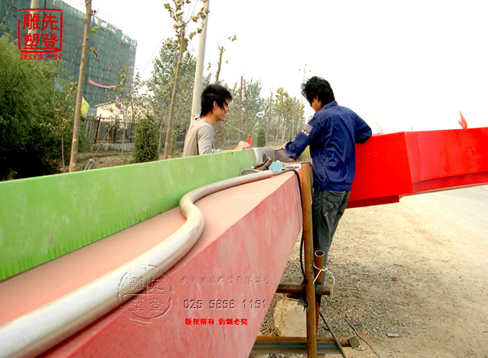 成功案例:不銹鋼大門雕塑安裝于天津市武清區(qū)陳咀鎮(zhèn),高度10米,跨度15米,不銹鋼大門雕塑
